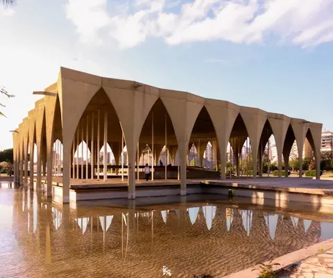 A square building with an area of 1000 square meters, surrounded by a peripheral gallery of pointed arches (7 arches on each façade), with steel columns to support the glazed squarish enclosure of the inner hall dedicated for exhibitions. It is dedicated to showcasing Lebanese products as a host country for the international fair, manifested on three interconnected levels through a pedestrian ramp and a staircase, equipped with a public toilet block, and the building is surrounded by reflective pools from all sides.